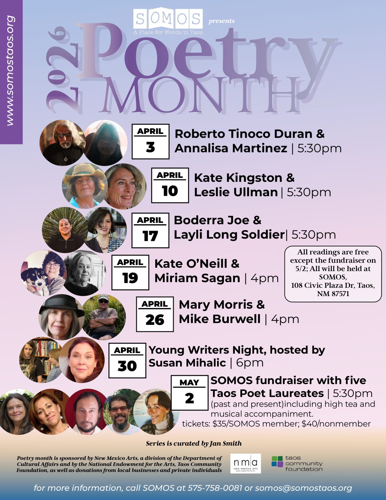 SOMOS programs are made possible in part by these organizations: New Mexico Arts, a Division of the Department of Cultural Affairs, and by the National Endowment for the Arts • Taos Community Foundation • The McCune Foundation • The National Endowment For The Arts • The Virginia Wellington Cabot Foundation • Taos County Lodgers Tax • TaosNetLLC for high speed internet service • Lions Club • Milagro Rotary Club • New Mexico Humanities Council • Nusenda Foundation • Witter Bynner Foundation • Amazon Literary Partnership • Literary Emergency Fund